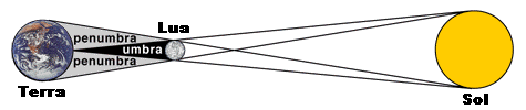 Um eclipse acontece sempre que um corpo entra na sombra de outro. Assim, quando a Lua entra na sombra da Terra, acontece um eclipse lunar. Quando a Terra é atingida pela sombra da Lua, acontece um eclipse solar.